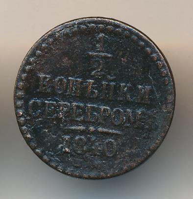 На новых монетах равенство серебряному курсу указано прямо в номинале: «1/2 КОПЕЙКИ СЕРЕБРОМ». Указ об их выпуске следует 6 сентября 1840 года («О новой медной монете на серебро 16-рублевого в пуде достоинства»). Массовая чеканка началось за год до этого на Екатеринбургском (знак ЕМ) и Сузунском (знак СМ) дворах. В качестве временной меры в 1840-1843 годах к ним подключается Ижорский завод (знак СПМ). С 1844 года после «значительного скопления медной монеты в народном обращении» в Екатеринбурге производство прекращается, а в Сузуне сокращается. Варшавский двор (знак MW), получив разрешение на выпуск общегосударственной монеты, успел отчеканить ее лишь в небольшом количестве в 1848 году.