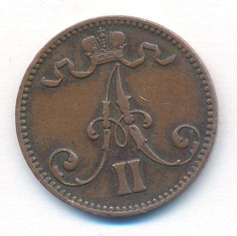 Лицевая сторона — вензель Александра II, оборотная — номинал (5 PENNIA) и дата. Нормативный вес — 6,40 грамма, гурт гладкий.