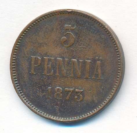 Лицевая сторона — вензель Александра II, оборотная — номинал (5 PENNIA) и дата. Нормативный вес — 6,40 грамма, гурт гладкий.