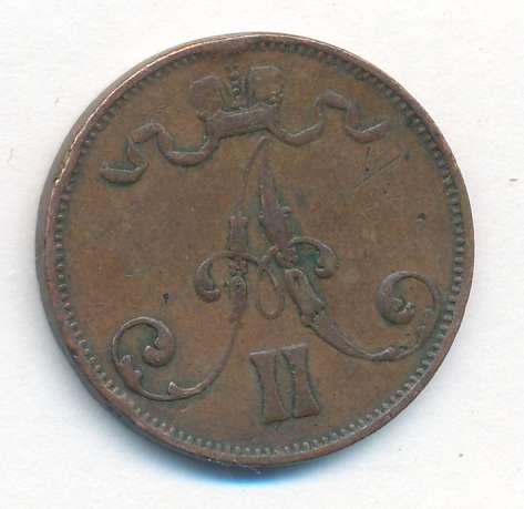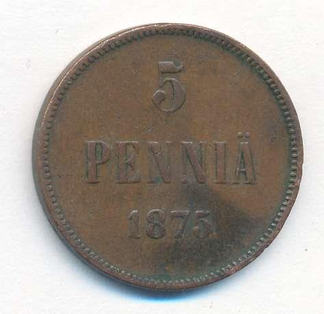 Лицевая сторона — вензель Александра II, оборотная — номинал (5 PENNIA) и дата. Нормативный вес — 6,40 грамма, гурт гладкий.