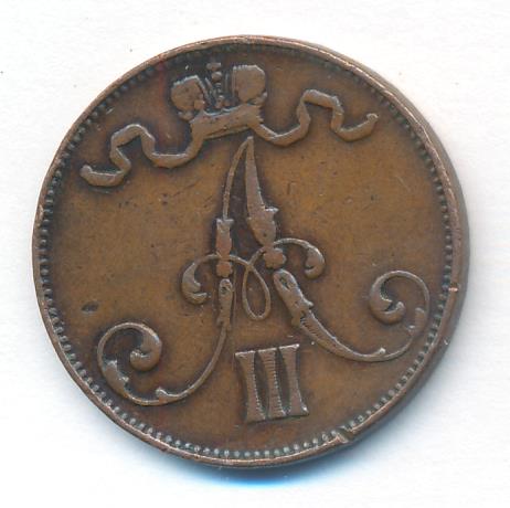 Лицевая сторона — вензель Александра II, оборотная — номинал (5 PENNIA) и дата. Нормативный вес — 6,40 грамма, гурт гладкий.