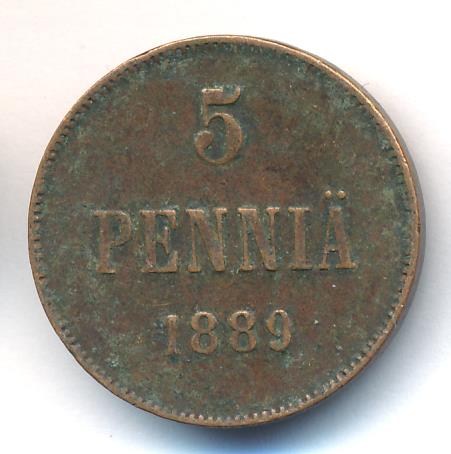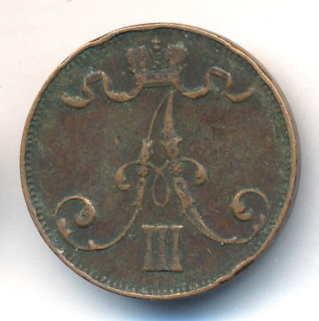 Лицевая сторона — вензель Александра II, оборотная — номинал (5 PENNIA) и дата. Нормативный вес — 6,40 грамма, гурт гладкий.
