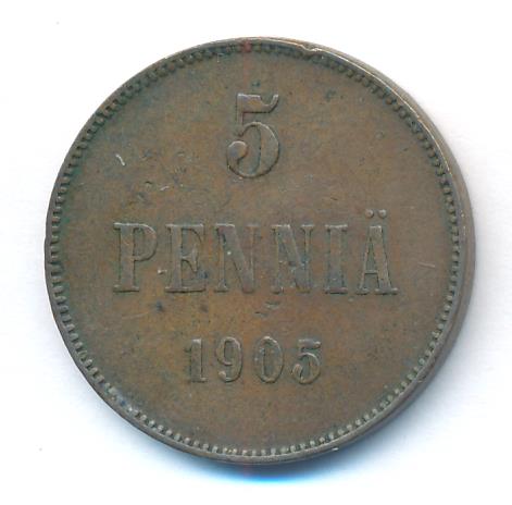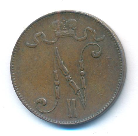 Лицевая сторона — вензель Александра II, оборотная — номинал (5 PENNIA) и дата. Нормативный вес — 6,40 грамма, гурт гладкий.