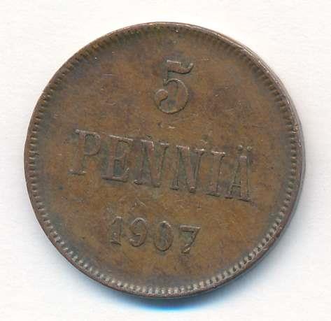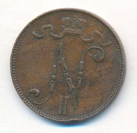 Лицевая сторона — вензель Александра II, оборотная — номинал (5 PENNIA) и дата. Нормативный вес — 6,40 грамма, гурт гладкий.