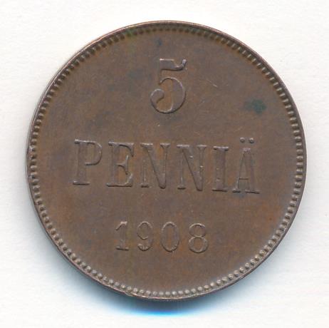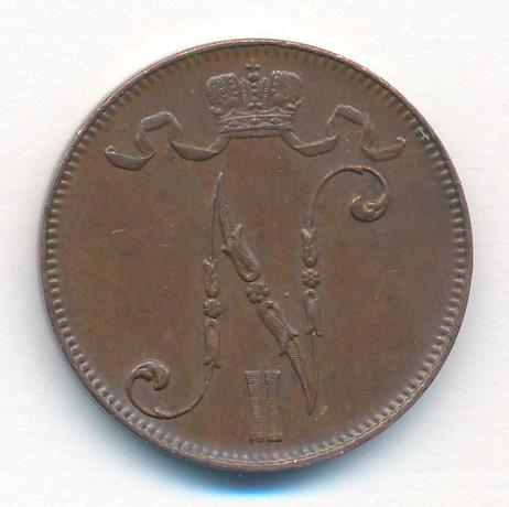 Лицевая сторона — вензель Александра II, оборотная — номинал (5 PENNIA) и дата. Нормативный вес — 6,40 грамма, гурт гладкий.