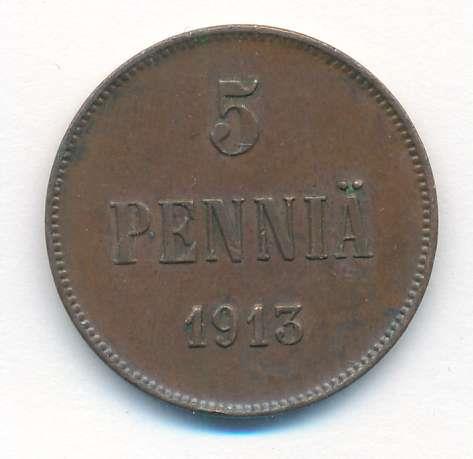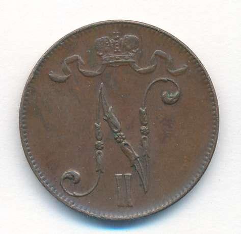 Лицевая сторона — вензель Александра II, оборотная — номинал (5 PENNIA) и дата. Нормативный вес — 6,40 грамма, гурт гладкий.