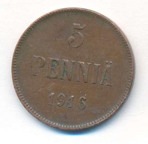Лицевая сторона — вензель Александра II, оборотная — номинал (5 PENNIA) и дата. Нормативный вес — 6,40 грамма, гурт гладкий.