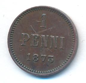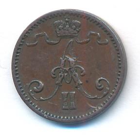Лицевая сторона — вензель Александра II, оборотная — номинал (1 PENNIA) и дата. Нормативный вес — 1,28 грамма, гурт гладкий.