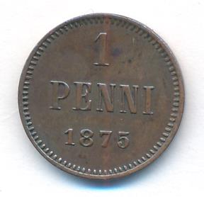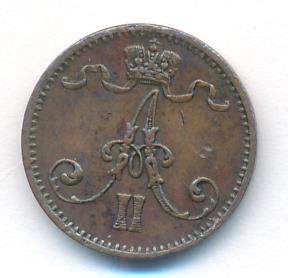 Лицевая сторона — вензель Александра II, оборотная — номинал (1 PENNIA) и дата. Нормативный вес — 1,28 грамма, гурт гладкий.