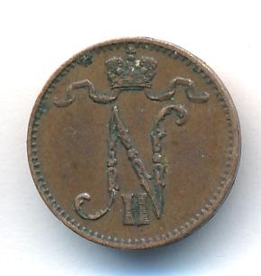 Лицевая сторона — вензель Александра II, оборотная — номинал (1 PENNIA) и дата. Нормативный вес — 1,28 грамма, гурт гладкий.