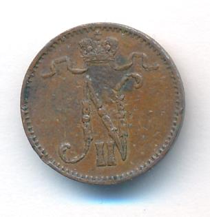 Лицевая сторона — вензель Александра II, оборотная — номинал (1 PENNIA) и дата. Нормативный вес — 1,28 грамма, гурт гладкий.