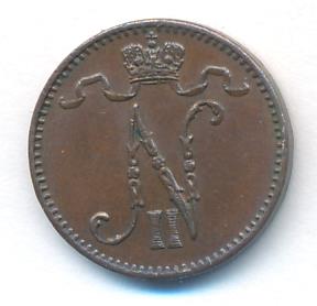 Лицевая сторона — вензель Александра II, оборотная — номинал (1 PENNIA) и дата. Нормативный вес — 1,28 грамма, гурт гладкий.