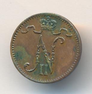 Лицевая сторона — вензель Александра II, оборотная — номинал (1 PENNIA) и дата. Нормативный вес — 1,28 грамма, гурт гладкий.