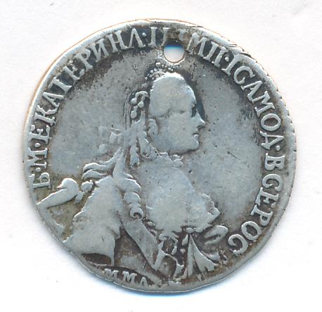 Выделяют два типа - «с шарфом на шее» и без него. Монеты 1764 года ММД со знаком гравера выполнены штемпелями полуполтин. На оборотной стороне монеты — двадцать счетных точек. Лицевая сторона — портрет императрицы и надпись «Б М ЕКАТЕРИНА II IМП I САМОД ВСЕРОС», оборотная — двуглавый орел, обозначение номинала цифрой и счетными точками и дата. Проба — 750, нормативный вес — 4,77 грамма, гурт — шнур.