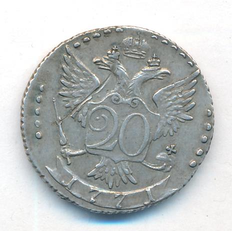 Выделяют два типа - «с шарфом на шее» и без него. Монеты 1764 года ММД со знаком гравера выполнены штемпелями полуполтин. На оборотной стороне монеты — двадцать счетных точек. Лицевая сторона — портрет императрицы и надпись «Б М ЕКАТЕРИНА II IМП I САМОД ВСЕРОС», оборотная — двуглавый орел, обозначение номинала цифрой и счетными точками и дата. Проба — 750, нормативный вес — 4,77 грамма, гурт — шнур.