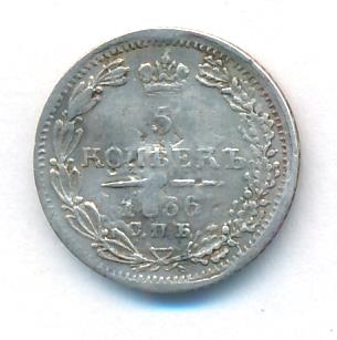 Лицевая сторона — новый гербовый орел с поднятыми крыльями, оборотная —обозначение номинала (5 копеекъ), окруженное венком из лавровой и дубовой ветвей и дата. Проба — 868, нормативный вес — 1,04 грамма.