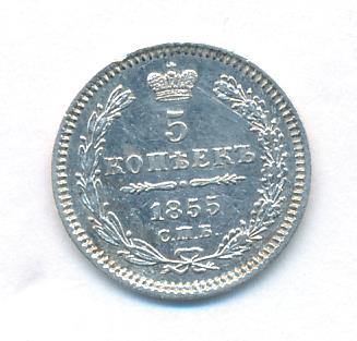 Лицевая сторона — новый гербовый орел с поднятыми крыльями, оборотная —обозначение номинала (5 копеекъ), окруженное венком из лавровой и дубовой ветвей и дата. Проба — 868, нормативный вес — 1,04 грамма.