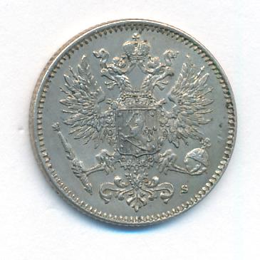 Лицевая сторона — российский двуглавый орел с гербом Великого княжества Финляндского на груди, оборотная — номинал и дата в венке из дубовых листьев. Проба — 750, нормативный вес — 2,55 грамма, гурт рубчатый.