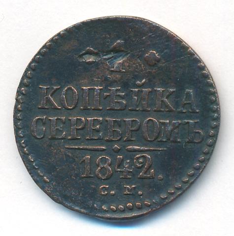 Лицевая сторона — вензель Николая I в бусовом ободке, оборотная — надпись «1 КОПЕЙКА СЕРЕБРОМ» и дата. Нормативный вес — 10,24 грамма, гурт гладкий.