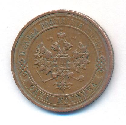 Лицевая сторона — двуглавый орел, надпись МЕДНАЯ РОССIЙСКАЯ МОНЕТА и обозначение номинала (одна копейка); оборотная — обозначение номинала (1 копейка) в бусовом ободке и дата. Нормативный вес — 3,28 грамма, гурт рубчатый.