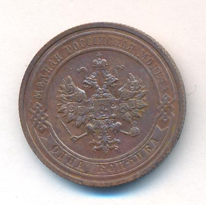 Лицевая сторона — двуглавый орел, надпись МЕДНАЯ РОССIЙСКАЯ МОНЕТА и обозначение номинала (одна копейка); оборотная — обозначение номинала (1 копейка) в бусовом ободке и дата. Нормативный вес — 3,28 грамма, гурт рубчатый.