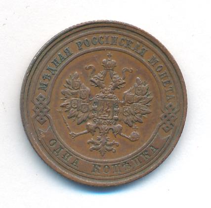 Лицевая сторона — двуглавый орел, надпись МЕДНАЯ РОССIЙСКАЯ МОНЕТА и обозначение номинала (одна копейка); оборотная — обозначение номинала (1 копейка) в бусовом ободке и дата. Нормативный вес — 3,28 грамма, гурт рубчатый.