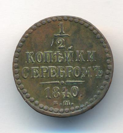 На новых монетах равенство серебряному курсу указано прямо в номинале: «1/2 КОПЕЙКИ СЕРЕБРОМ». Указ об их выпуске следует 6 сентября 1840 года («О новой медной монете на серебро 16-рублевого в пуде достоинства»). Массовая чеканка началось за год до этого на Екатеринбургском (знак ЕМ) и Сузунском (знак СМ) дворах. В качестве временной меры в 1840-1843 годах к ним подключается Ижорский завод (знак СПМ). С 1844 года после «значительного скопления медной монеты в народном обращении» в Екатеринбурге производство прекращается, а в Сузуне сокращается. Варшавский двор (знак MW), получив разрешение на выпуск общегосударственной монеты, успел отчеканить ее лишь в небольшом количестве в 1848 году.