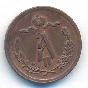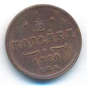 Лицевая сторона — вензель Александра II в венке из лавровой и дубовой ветвей; оборотная — обозначение номинала (1/2 копейки) и дата. Нормативный вес — 1,64 грамма, гурт рубчатый.