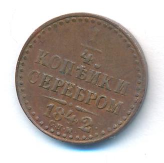 Лицевая сторона — вензель Николая I в бусовом ободке, оборотная — надпись «1/4 КОПЕЙКИ СЕРЕБРОМ» и дата. Нормативный вес — 2,56 грамма, гурт гладкий.