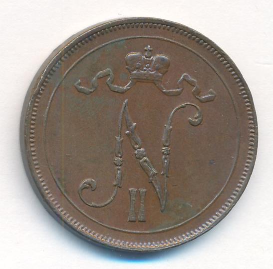 Лицевая сторона — вензель Александра II, оборотная — номинал (10 PENNIA) в венке из дубовых ветвей и дата. Нормативный вес — 12,80 грамма, гурт гладкий.