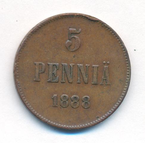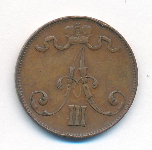 Лицевая сторона — вензель Александра II, оборотная — номинал (5 PENNIA) и дата. Нормативный вес — 6,40 грамма, гурт гладкий.