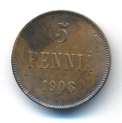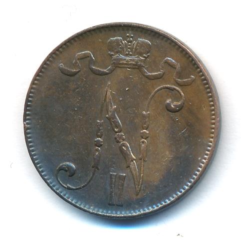 Лицевая сторона — вензель Александра II, оборотная — номинал (5 PENNIA) и дата. Нормативный вес — 6,40 грамма, гурт гладкий.
