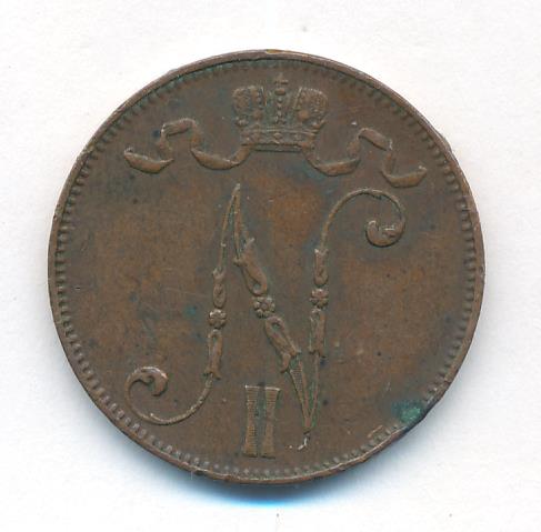 Лицевая сторона — вензель Александра II, оборотная — номинал (5 PENNIA) и дата. Нормативный вес — 6,40 грамма, гурт гладкий.