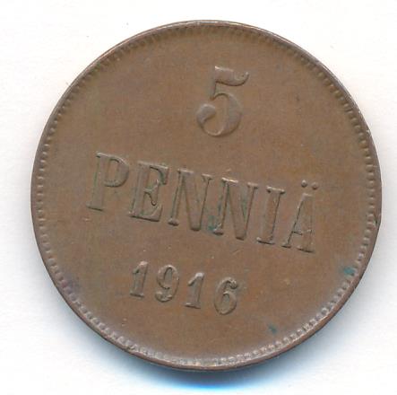 Лицевая сторона — вензель Александра II, оборотная — номинал (5 PENNIA) и дата. Нормативный вес — 6,40 грамма, гурт гладкий.