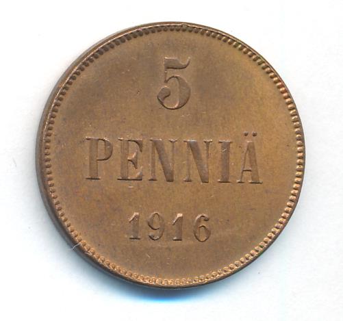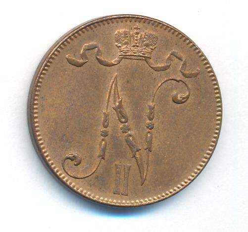 Лицевая сторона — вензель Александра II, оборотная — номинал (5 PENNIA) и дата. Нормативный вес — 6,40 грамма, гурт гладкий.