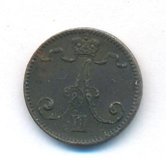 Лицевая сторона — вензель Александра II, оборотная — номинал (1 PENNIA) и дата. Нормативный вес — 1,28 грамма, гурт гладкий.