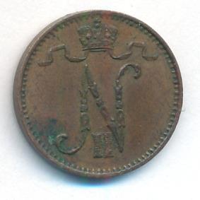 Лицевая сторона — вензель Александра II, оборотная — номинал (1 PENNIA) и дата. Нормативный вес — 1,28 грамма, гурт гладкий.
