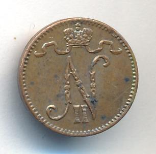 Лицевая сторона — вензель Александра II, оборотная — номинал (1 PENNIA) и дата. Нормативный вес — 1,28 грамма, гурт гладкий.