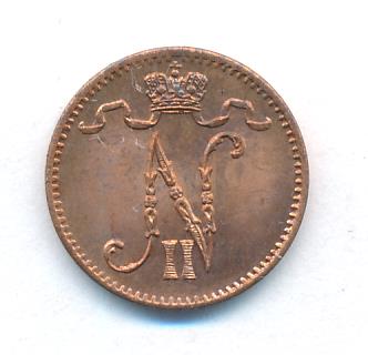Лицевая сторона — вензель Александра II, оборотная — номинал (1 PENNIA) и дата. Нормативный вес — 1,28 грамма, гурт гладкий.