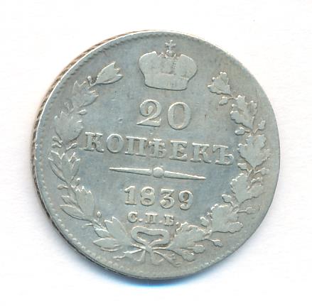 Лицевая сторона — новый гербовый орел с поднятыми крыльями, оборотная —обозначение номинала (20 копеекъ), окруженное венком из лавровой и дубовой ветвей и дата. Проба — 868, нормативный вес — 4,15 грамма.