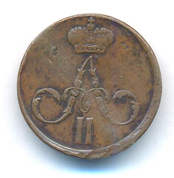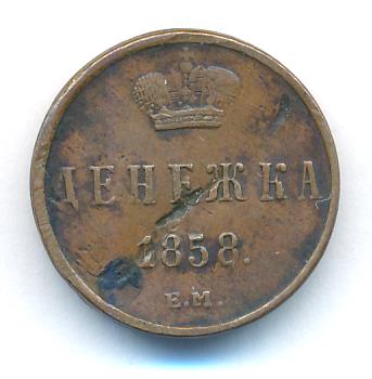Лицевая сторона — вензель Николая I, оборотная — обозначение номинала (денежка) и дата. Нормативный вес — 2,56 грамма, гурт гладкий.