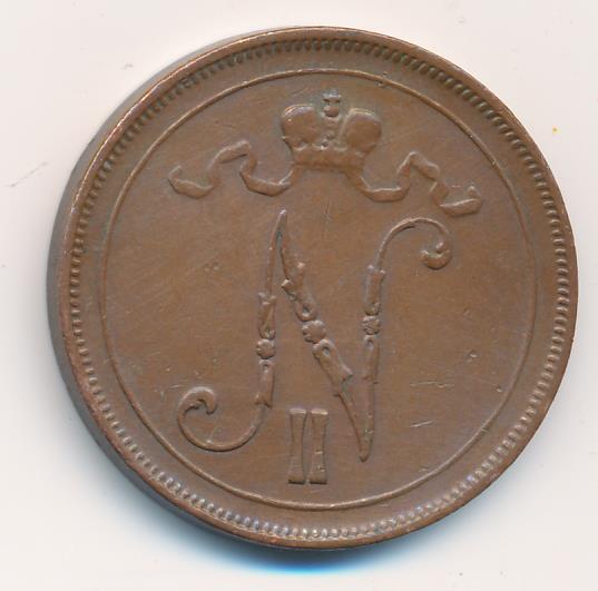 Лицевая сторона — вензель Александра II, оборотная — номинал (10 PENNIA) в венке из дубовых ветвей и дата. Нормативный вес — 12,80 грамма, гурт гладкий.