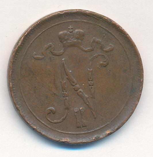 Лицевая сторона — вензель Александра II, оборотная — номинал (10 PENNIA) в венке из дубовых ветвей и дата. Нормативный вес — 12,80 грамма, гурт гладкий.