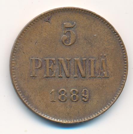 Лицевая сторона — вензель Александра II, оборотная — номинал (5 PENNIA) и дата. Нормативный вес — 6,40 грамма, гурт гладкий.