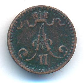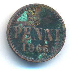 Лицевая сторона — вензель Александра II, оборотная — номинал (1 PENNIA) и дата. Нормативный вес — 1,28 грамма, гурт гладкий.