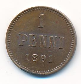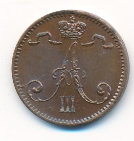 Лицевая сторона — вензель Александра II, оборотная — номинал (1 PENNIA) и дата. Нормативный вес — 1,28 грамма, гурт гладкий.