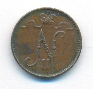Лицевая сторона — вензель Александра II, оборотная — номинал (1 PENNIA) и дата. Нормативный вес — 1,28 грамма, гурт гладкий.