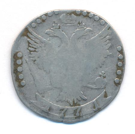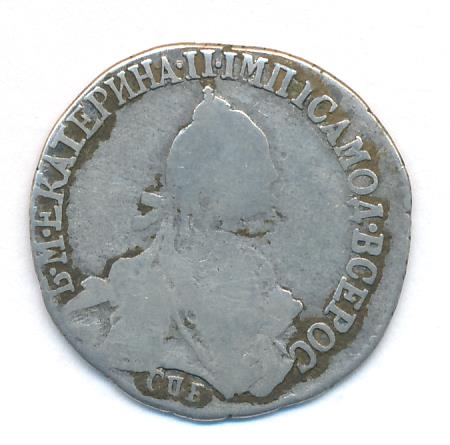 Выделяют два типа - «с шарфом на шее» и без него. Монеты 1764 года ММД со знаком гравера выполнены штемпелями полуполтин. На оборотной стороне монеты — двадцать счетных точек. Лицевая сторона — портрет императрицы и надпись «Б М ЕКАТЕРИНА II IМП I САМОД ВСЕРОС», оборотная — двуглавый орел, обозначение номинала цифрой и счетными точками и дата. Проба — 750, нормативный вес — 4,77 грамма, гурт — шнур.