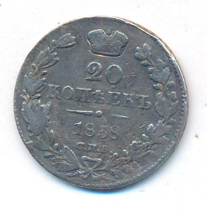 Лицевая сторона — новый гербовый орел с поднятыми крыльями, оборотная —обозначение номинала (20 копеекъ), окруженное венком из лавровой и дубовой ветвей и дата. Проба — 868, нормативный вес — 4,15 грамма.