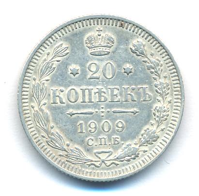 Лицевая сторона — гербовый орел, оборотная —обозначение номинала (20 копеекъ), окруженное венком из лавровой и дубовой ветвей и дата.